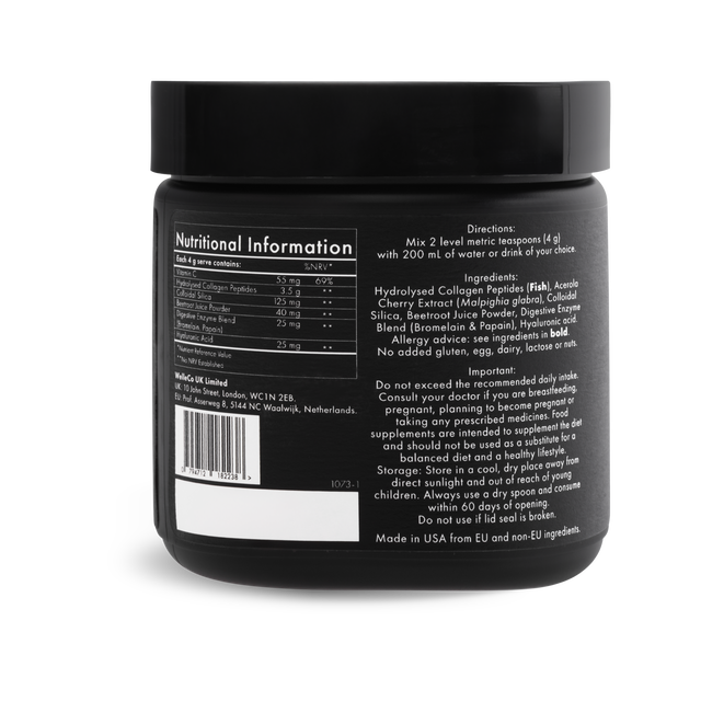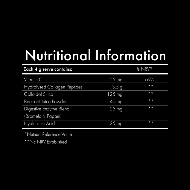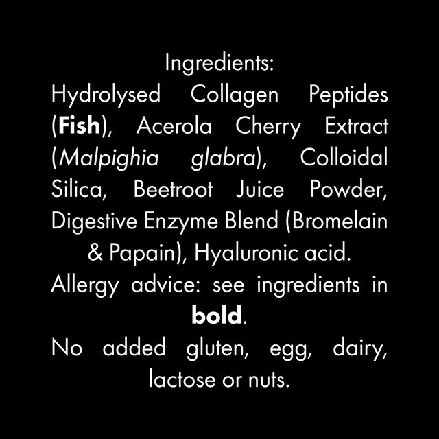 Ingredients: Hydrolysed Collagen Peptides (Fish), Acerola Cherry Extract (Malpighia glabra), Colloidal Silica, Beetroot Juice Powder, Digestive Enzyme Blend (Bromelain & Papain), Hyaluronic acid.