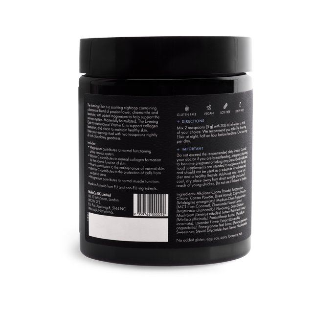 Directions: Mix 2 teaspoons (5 g) with 200 ml of warm water or milk of your choice. We recommend you take The Evening Elixir at night, 1 hour before bedtime or when you want to relax and unwind. One serving per day.