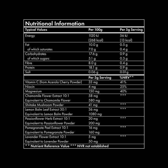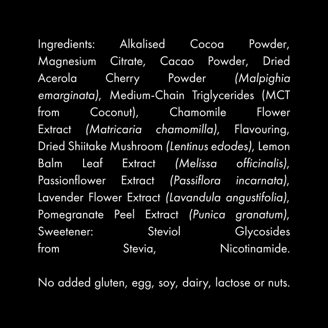 Each serve (5 g) contains: Alkalised Cocoa Powder, Magnesium Citrate, Cacao Powder, Dried Acerola Cherry Powder (Malpighia emarginata), Medium-Chain Triglycerides (MCT from Coconut), Chamomile Flower Extract (Matricaria chamomilla), Flavouring, Dried Shiitake Mushroom (Lentinus edodes), Lemon Balm Leaf Extract (Melissa officinalis), Passionflower Extract (Passiflora incarnata), Lavender Flower Extract (Lavandula angustifolia), Pomegranate Peel Extract (Punica granatum), Sweetener: Steviol Glycosides from Stevia, Nicotinamide.